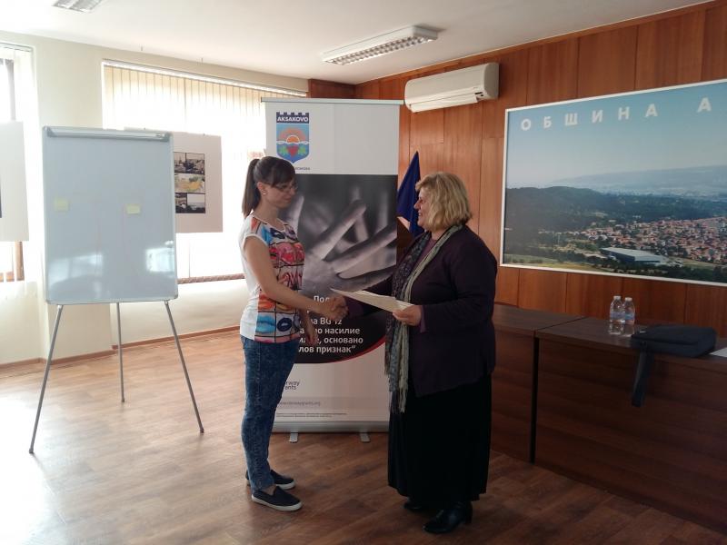В периода 4.04.2016-8.04.2016 г. в гр. Аксаково се проведе „въвеждащо“ обучение на персонала на кризисния център от „Психосървиз“ ЕООД. Проведеното обучение бе с продължителност 40 уч. часа, участваха всички лица от персонала и бяха връчени сертификати за преминато обучение. Участниците получиха знания за политиката и практиките в областта на социалните услуги, основни нормативни документи, институции и партньорски организации, свързани с предоставянето на услугата. Обучението представи спецификите, нуждите и подходите на работа с деца/лица, жертви на трафик и насилие.
